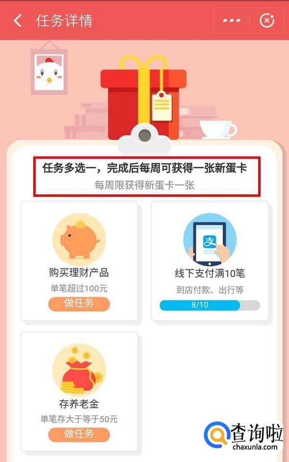 点击新蛋卡,看到任务说明,每周完成任意一个任务可获取一张新蛋卡,这个必须完成;