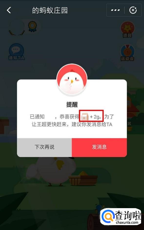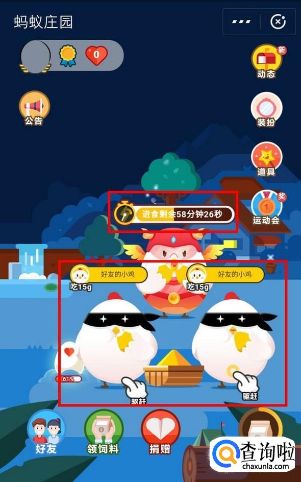 点击正在蹭饭的小鸡,是先获得饲料的,至于需不需要发消息通知好友,这个无所谓;