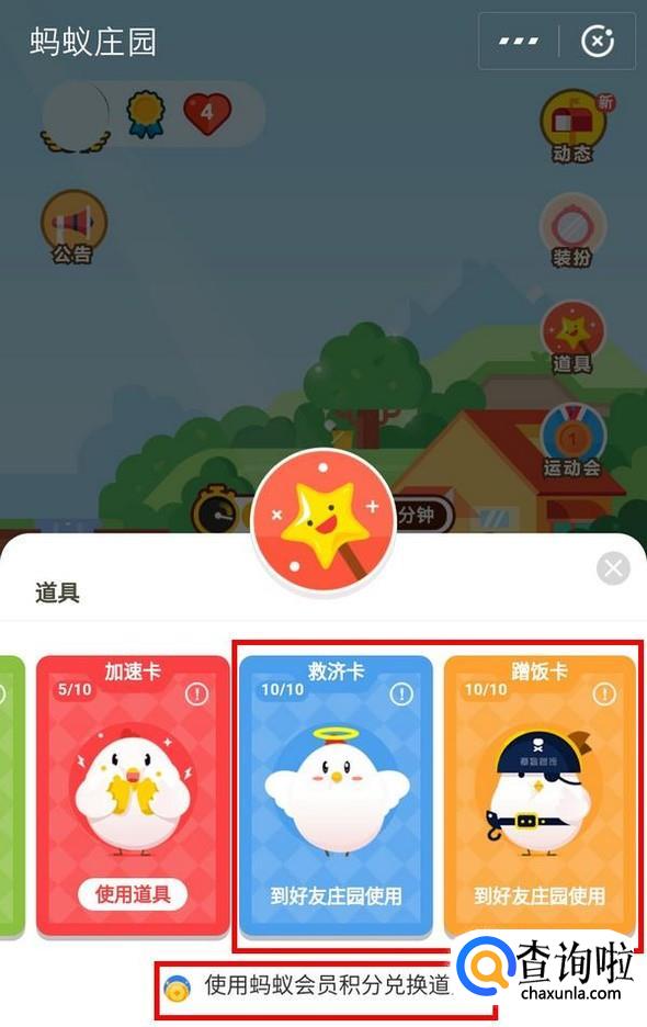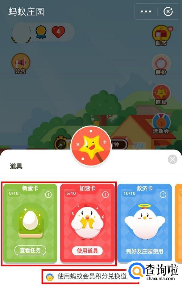 首先道具里面最重要的两个道具是“新蛋卡”和“加速卡”,新蛋卡需要做任务,使用以后可以直接得到一颗鸡蛋,加速卡可以使小鸡一次吃饲料的时间缩短到4个小时,可通过运动会和蚂蚁积分获取;