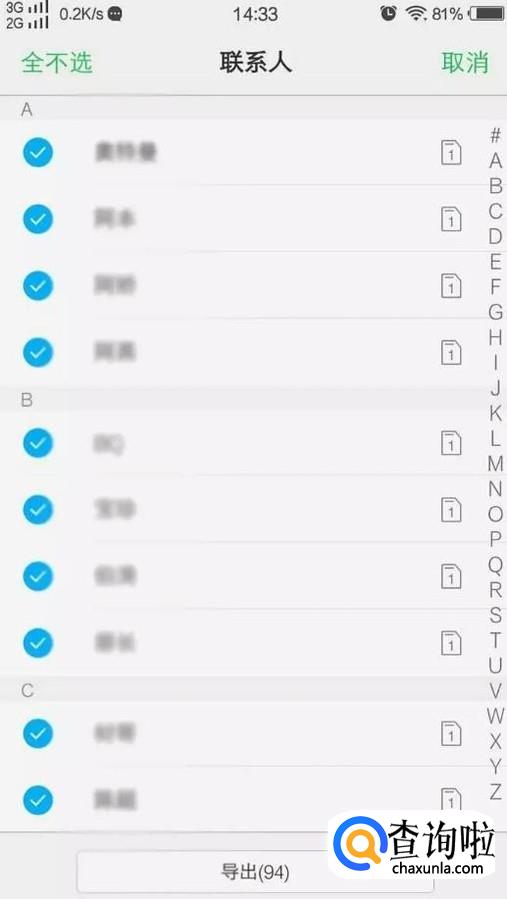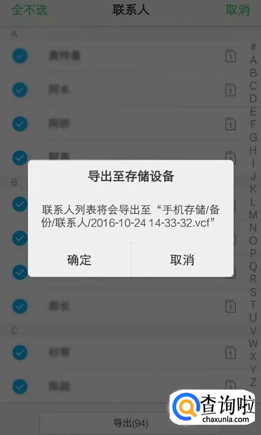 单独选择备份的联系人或全部选中(打勾即选中),点击下方导出按钮,备份联系人,完成后点确定。