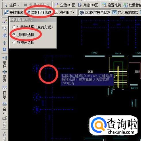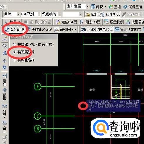 点击绘图区域上方的提取轴线,用按图层选择的方式,然后点击图纸中的cad轴线,选择后点击右键确定提取。