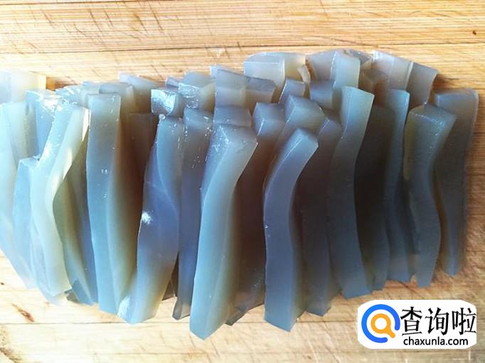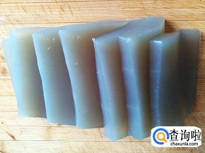 把准备好的凉粉先如图切成适量厚度的片。