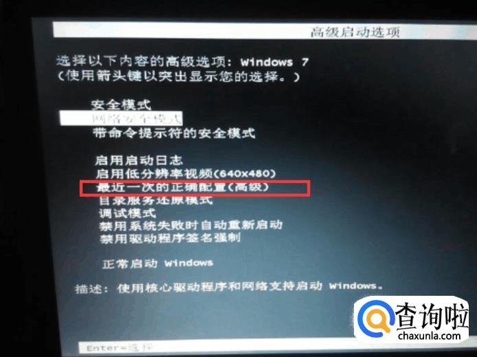 进入最后一次正确配置进行调整,开机长按F8,进入高级选项页面,选择“最近一次的正确配置”,然后回车,在进入系统之后,查杀病毒。