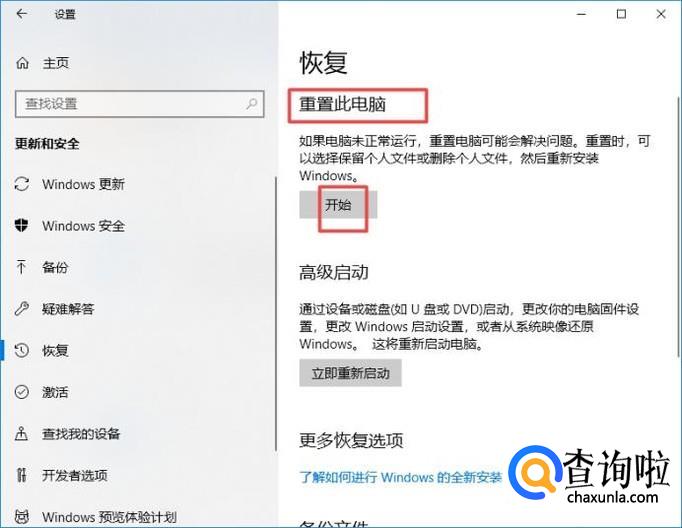 然后我们会看到重置此电脑,我们点击下方的开始;