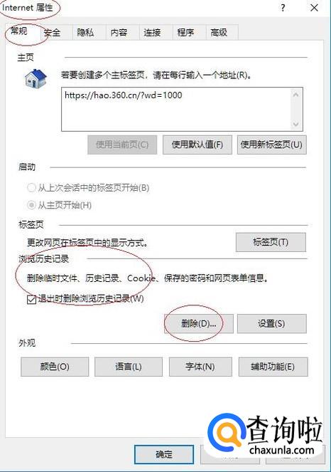 如图所示,弹出"Internet选项"对话框。选择"常规"标签,点击"浏览历史记录→删除"按钮。
