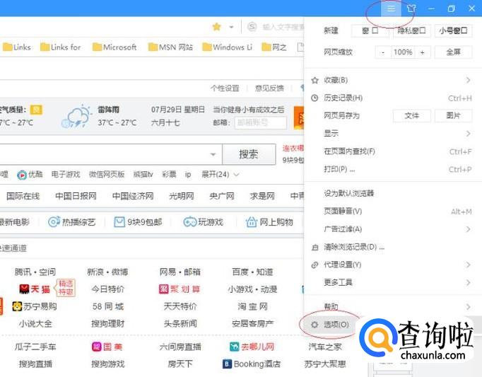 如图所示,唤出"搜狗高速浏览器"程序窗口。点击右上角"显示菜单"按钮,弹出下拉菜单选择"选项"项。