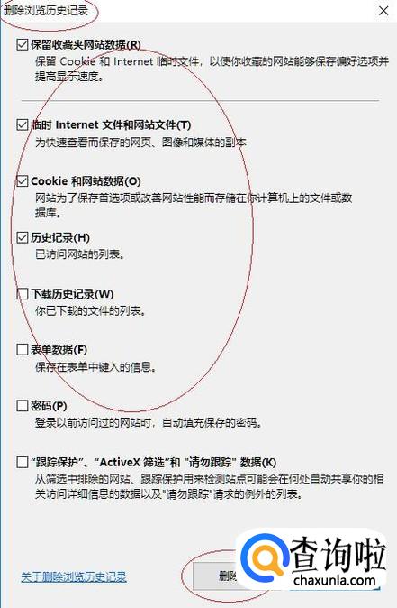 弹出"删除浏览历史记录"对话框,如图所示。勾选所有项目复选框,点击"删除"按钮。