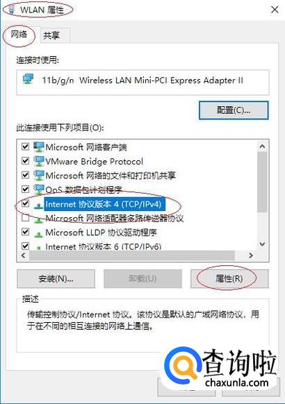 如图所示,唤出"WLAN 属性"对话框。勾选"Internet协议版本4(TCP/IPv4)"复选框,设置完成点击"属性"按钮。