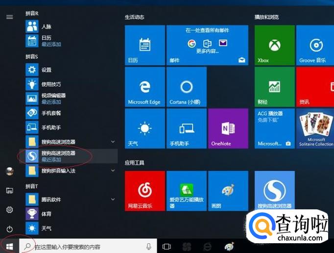 启动Windows 10操作系统,如图所示。点击任务栏"开始"按钮,弹出开始菜单选择"搜狗高速浏览器"项。