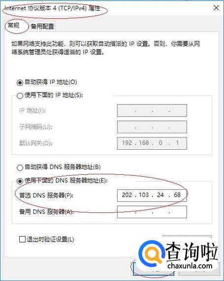 选择"Internet协议版本4(TCP/IPv4)属性→常规"标签,如图所示。手动输入检测最快的DNS地址,本例到此希望对大家能有所帮助。
