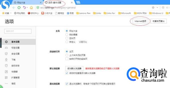 唤出"选项-基本设置"页面,如图所示。点击右侧"Internet选项"按钮,下步将进行排除上网速度慢的操作。
