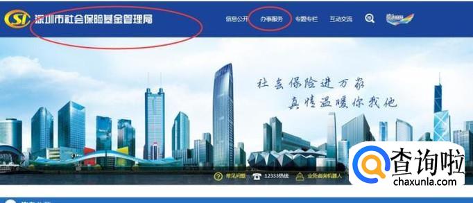 进入到【深圳社会保险基金管理局】主页,点击【办事服务】选项,如下图所示: