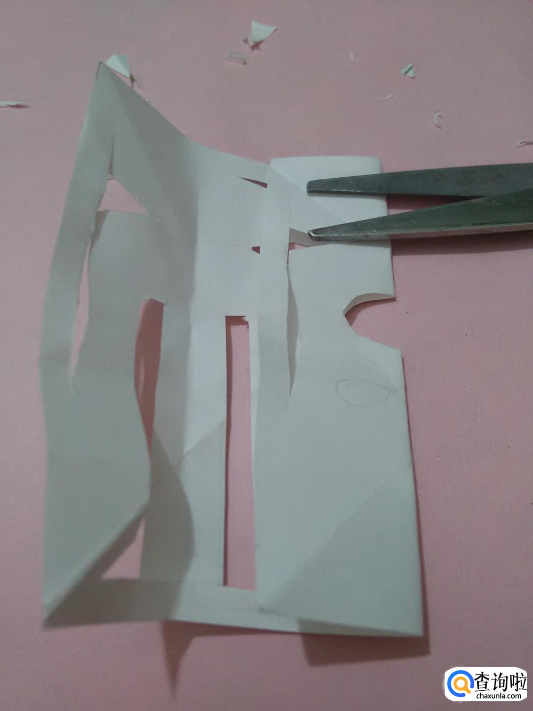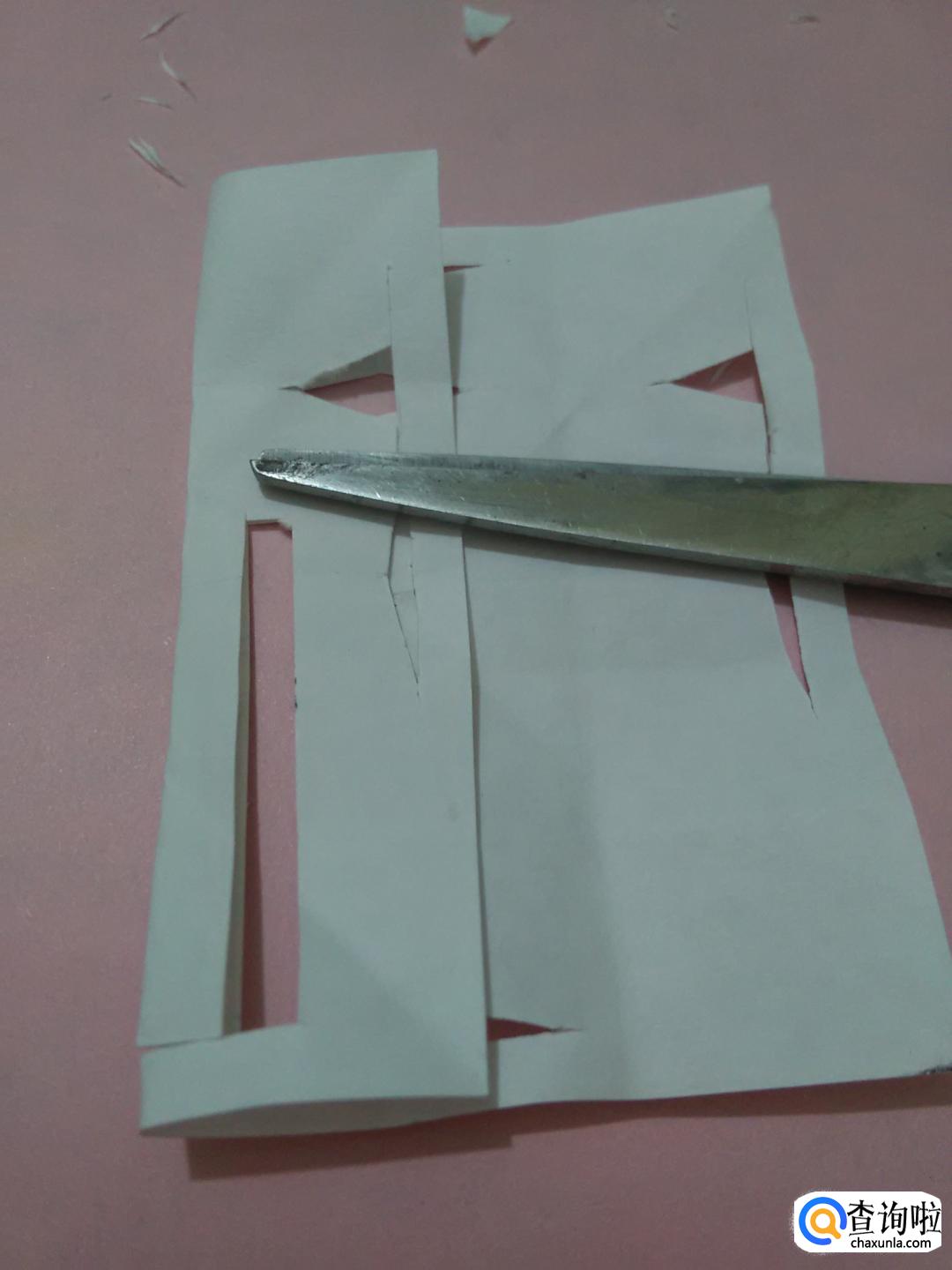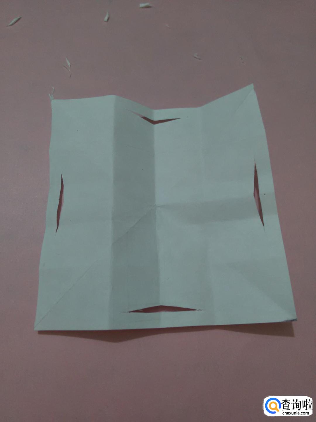 把纸打开,再把左边四分之一部分向右折,用剪子从下面三等份的中间剪掉一个细细的长方形。