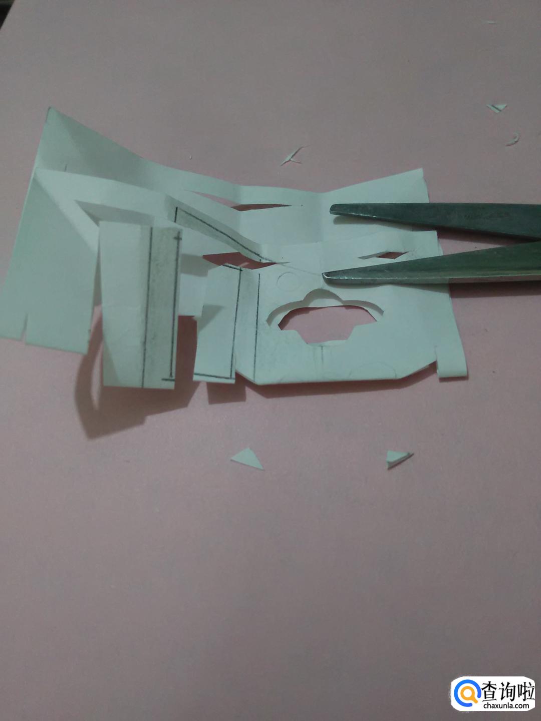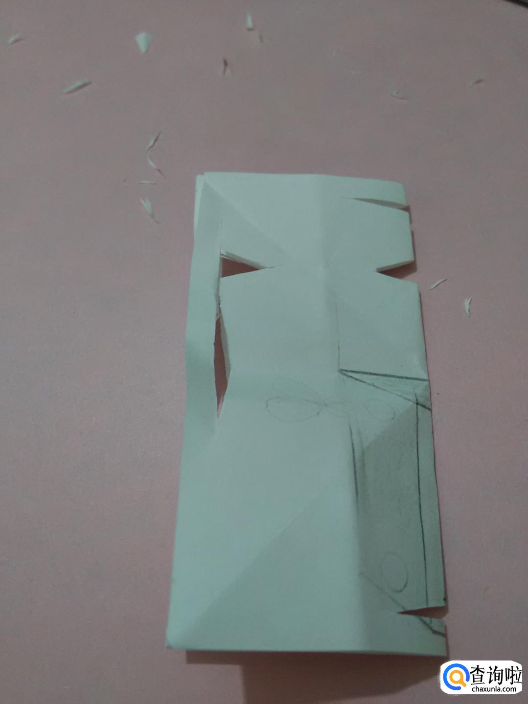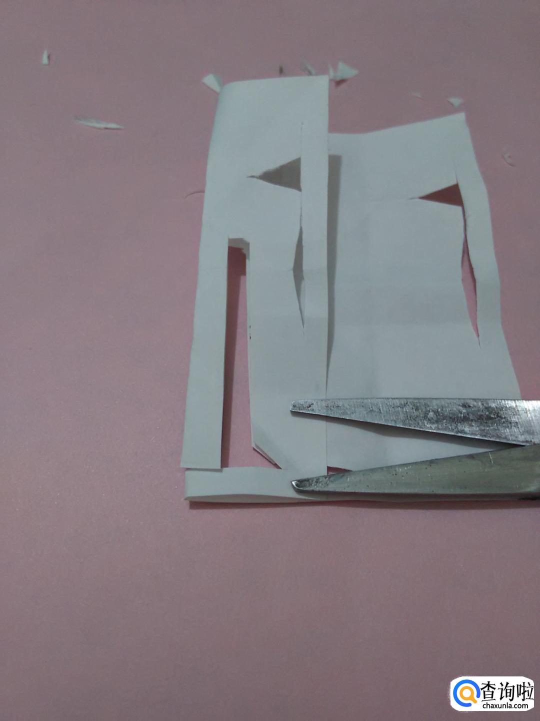 把纸打开,再把左边四分之一部分向右折,用剪子从下面三等份的中间剪掉一个细细的长方形。
