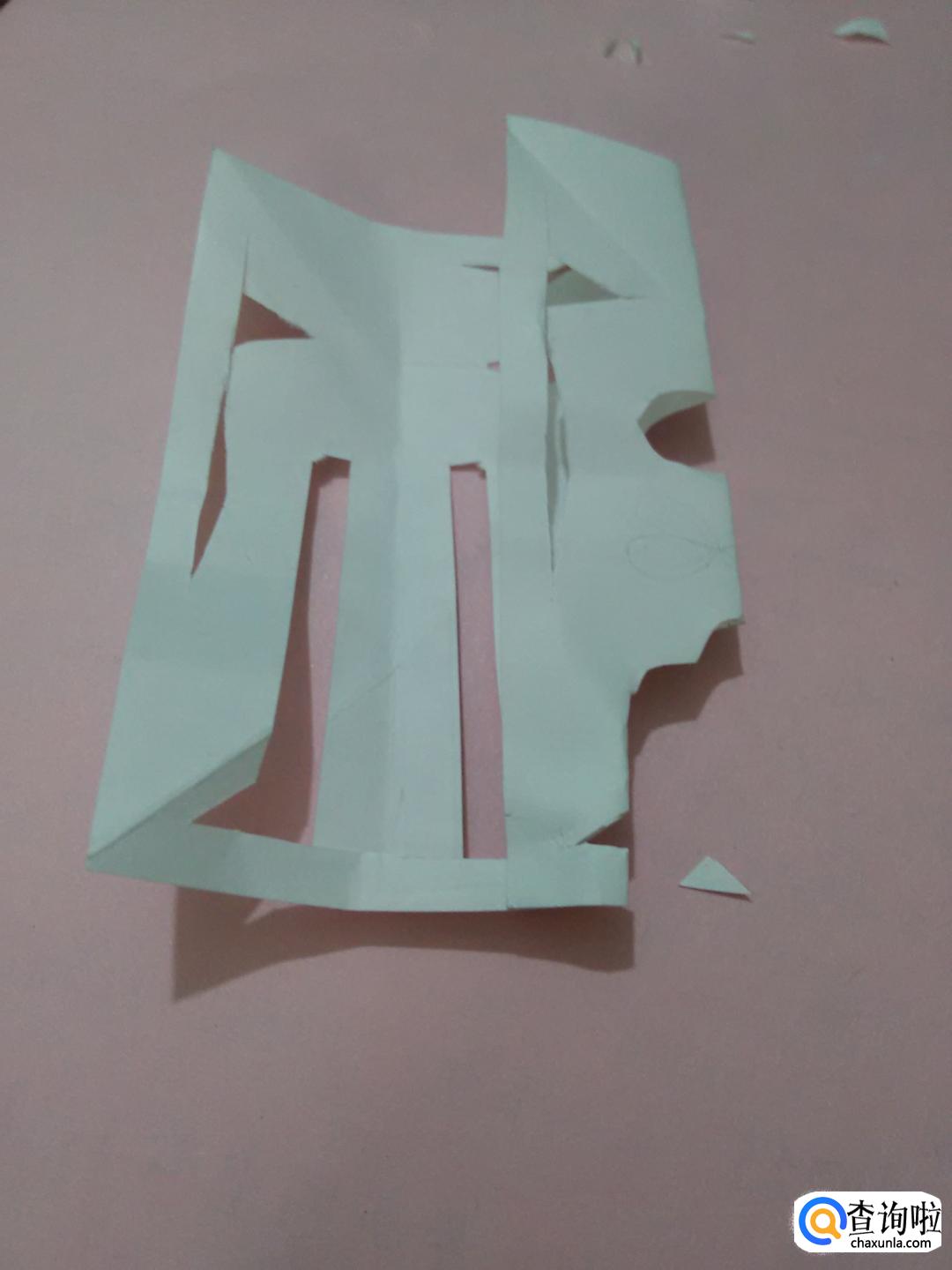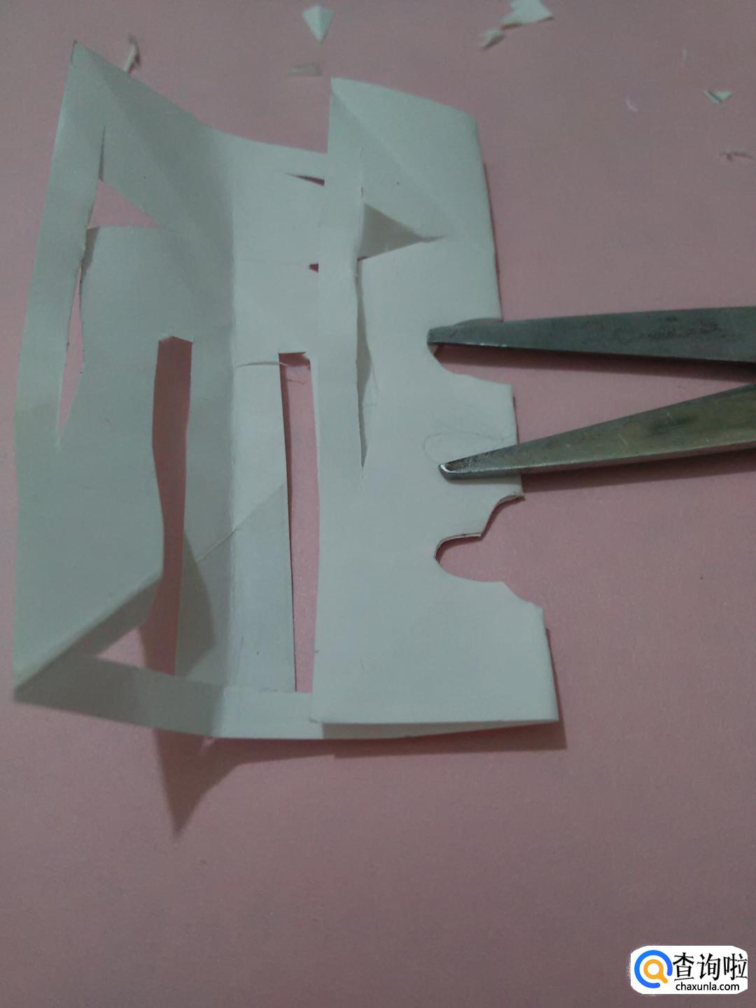 再用剪刀将第四条横线处剪三条相连的弧线,剪出福字下方的田字。