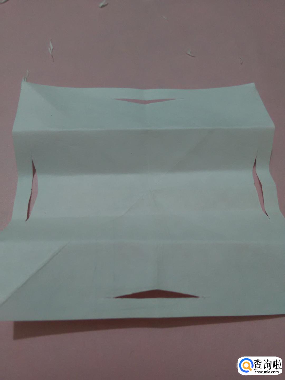 将下面二等份的部分向上对折,用剪刀在第三条横线的左右两端各剪掉一个三角形。