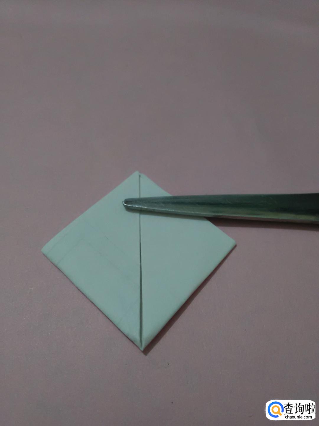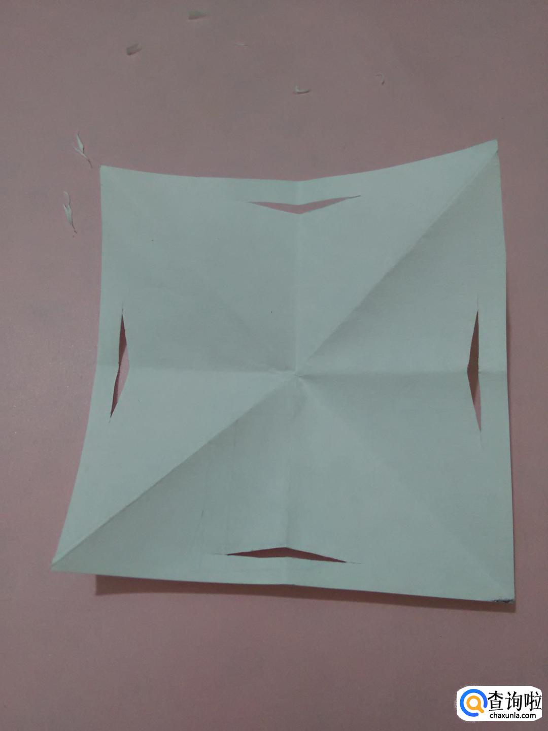把正方形的右边向左对折,用剪刀在第一条横线的左右两侧各剪掉一个三角形,剪圆一点,更好看。