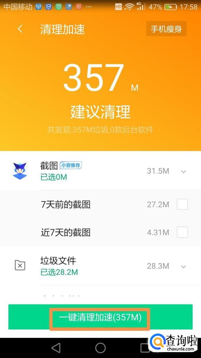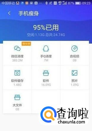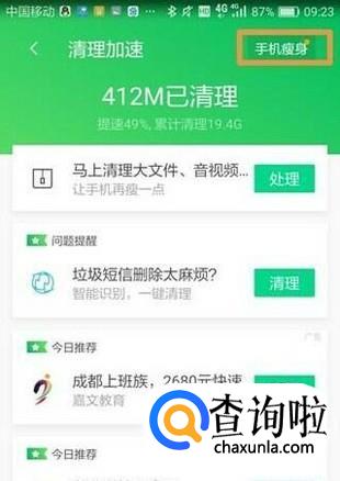 清理完成后可以进行进一步的加速,点击屏幕右上角的“手机瘦身”,对占用手机内存的无用内容进行清理。