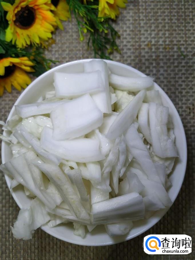 锅中烧开水,水开后将粉条焯一下,捞出泡开,再准备适量大白菜,洗净后,切段,放入盘中备用。