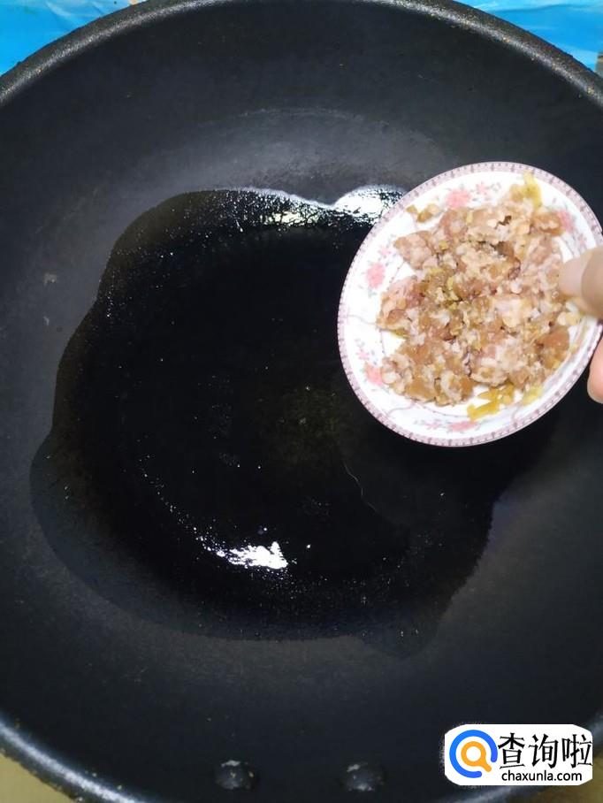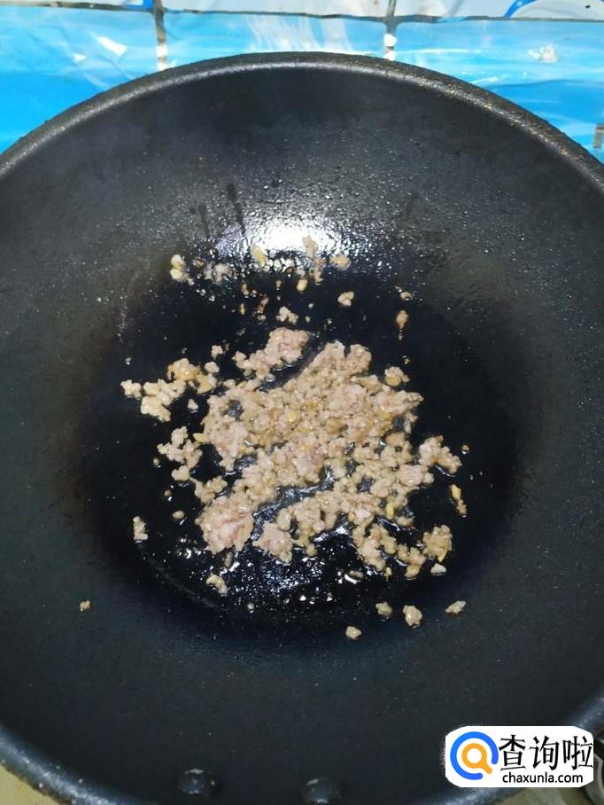 炒锅中放入适量油,油热后,将五花肉末倒入锅中,炒香。