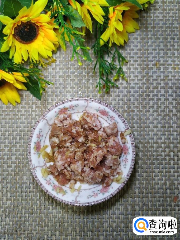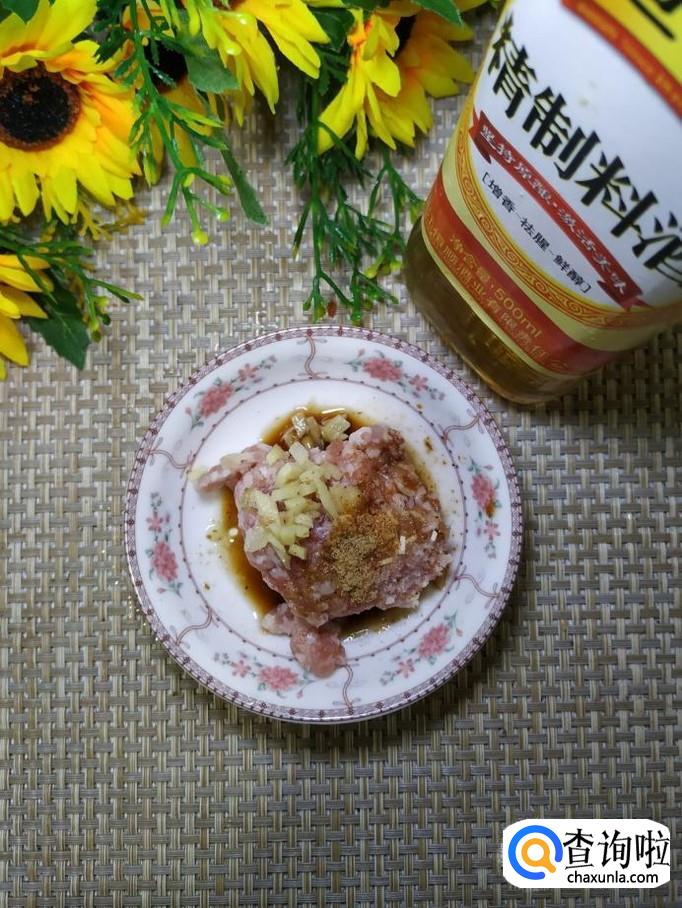 刚才适量五花肉,洗净后,剁成肉末,加入适量盐,鸡精,五香粉,生抽,料酒,姜末,搅拌均匀,腌制十分钟。