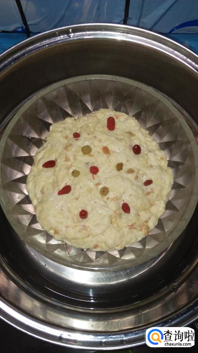 面团发酵好之后,在上面均匀的放上一些枸杞子和葡萄干,可以用手轻轻按进去。冷水上锅,水开后,蒸20分钟。
