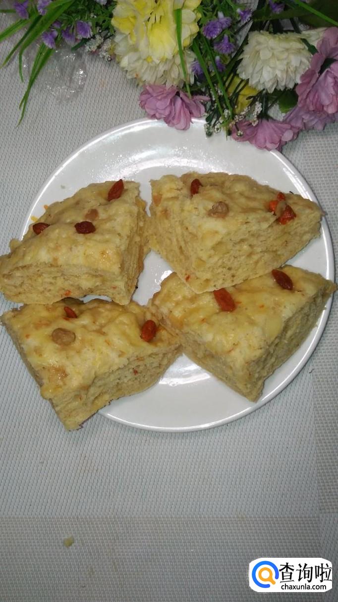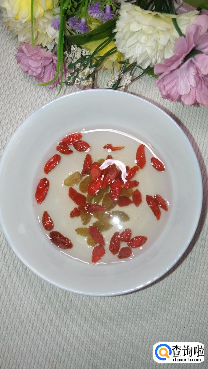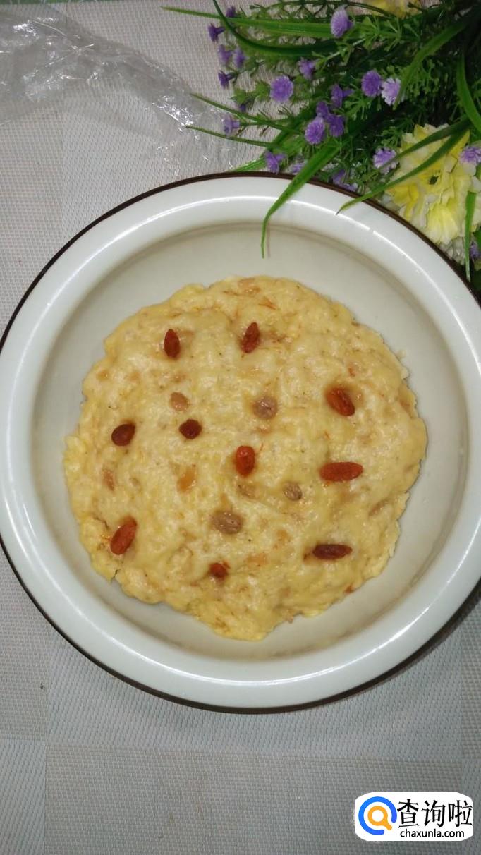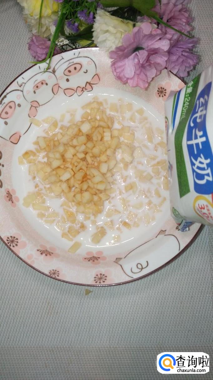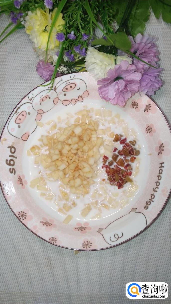 将适量纯牛奶倒入碗中,再将适量枸杞子和葡萄干切碎,和苹果碎放在一起,用牛奶来做发糕,非常营养。
