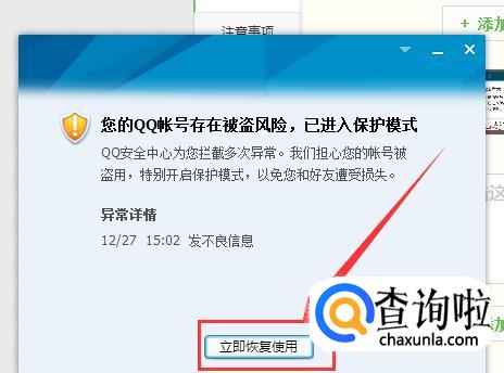 发现QQ被盗后,可用电脑登录一下自己的QQ账号,然后页面会提示QQ存在被盗风险,已进入保护模式,这就说明QQ被冻结了。