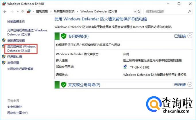 弹出的界面,我们点击启用或关闭Windows Defender防火墙;