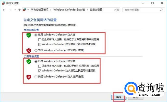 弹出的界面,我们想要开启的话,就将专用网络设置和公用网络设置中都点击启用Windows Defender防火墙,关闭的话,点击关闭Windows Defender防火墙就可以了。