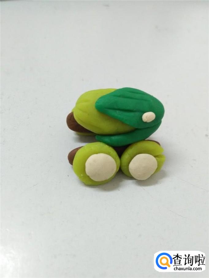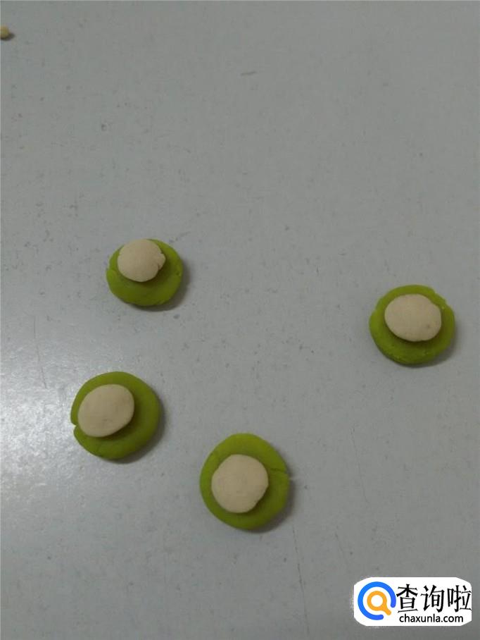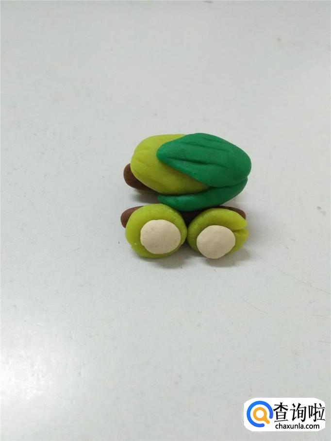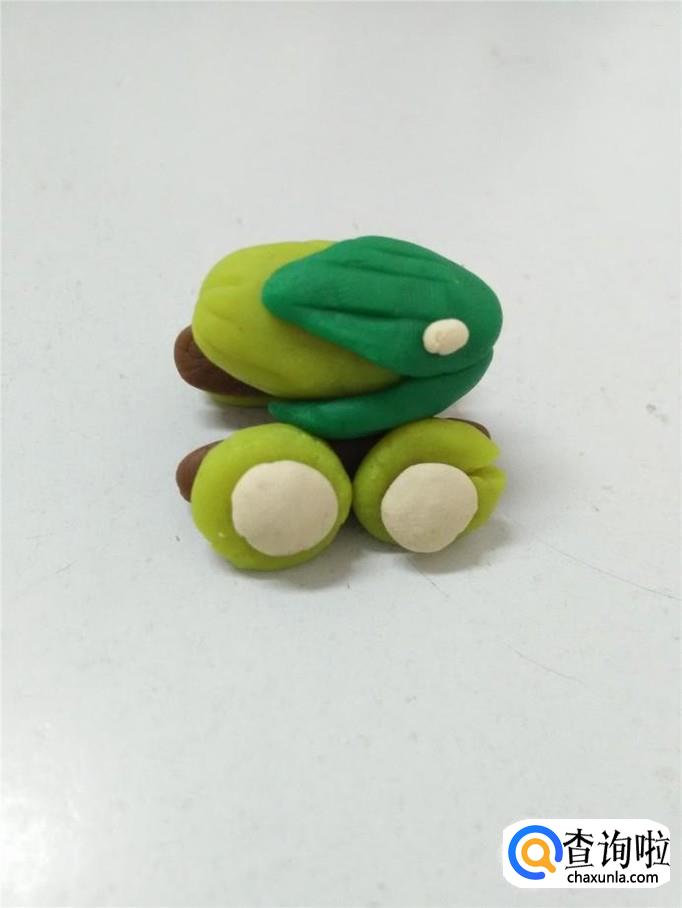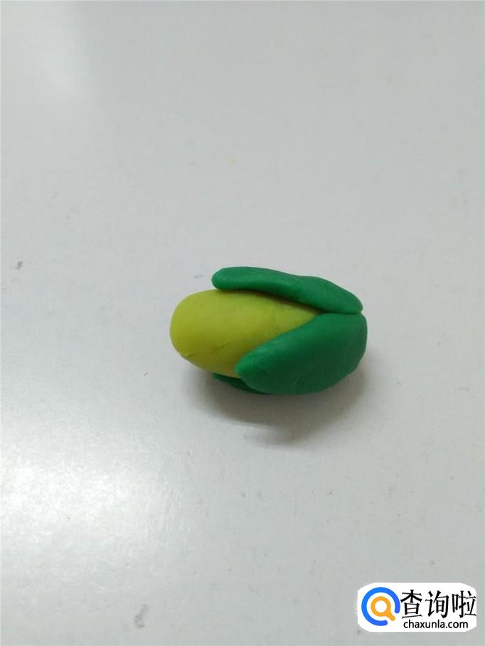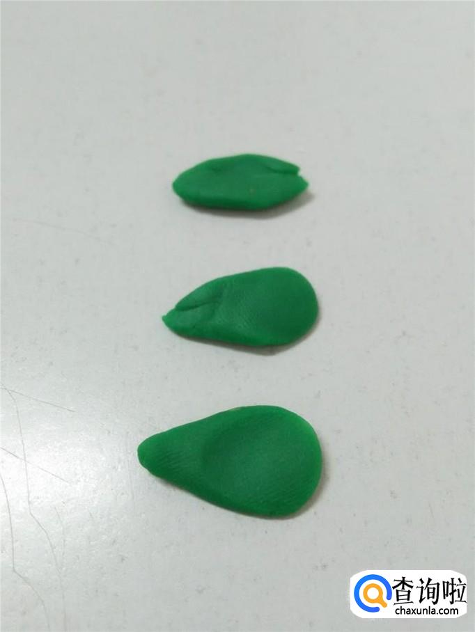 再用绿色捏三个水滴形状,当作叶子。