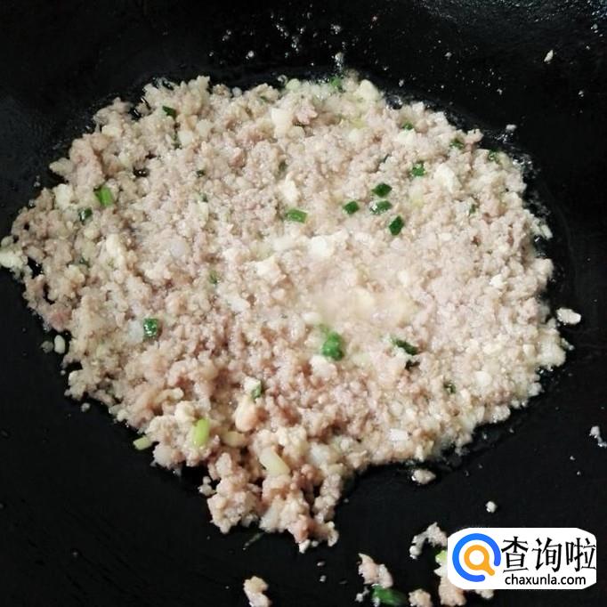 锅烧七成热,放少量花生油,先下蒜末小火煸出香味,再把肉末放下去大火炒至肉变成白色后铲出来备用。