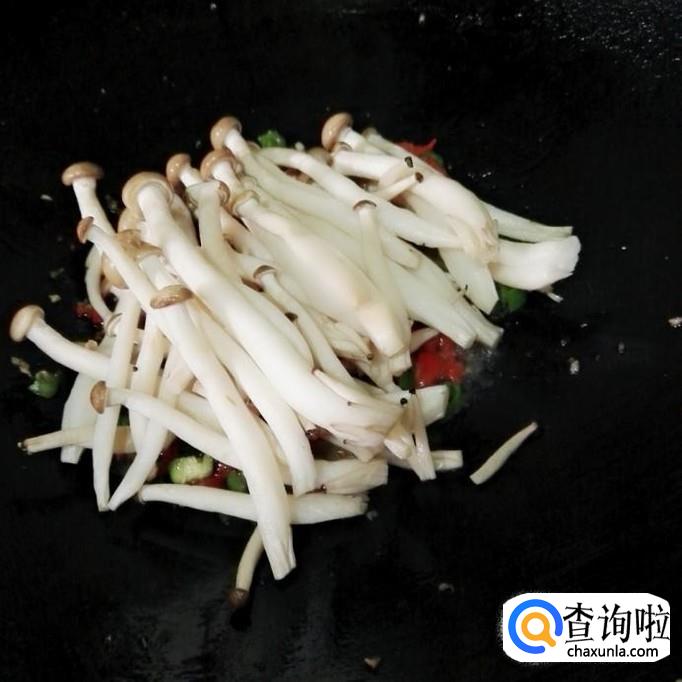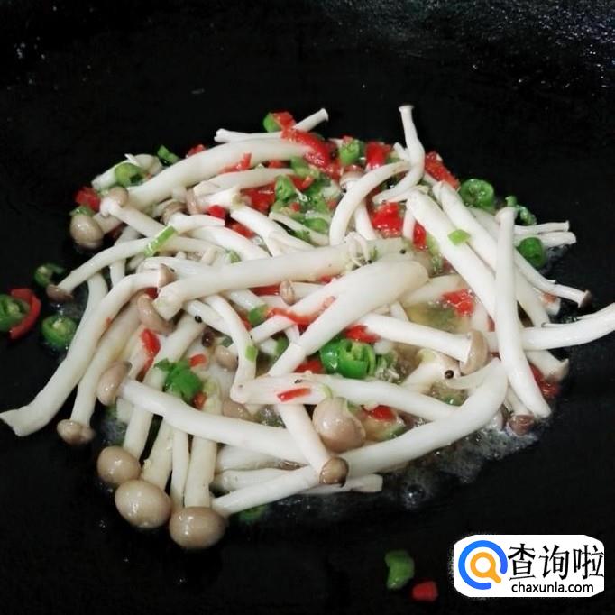 锅洗一下再来炒辣椒,辣椒只需炒断生就好,接着把蟹味菇放下去开大火翻炒。