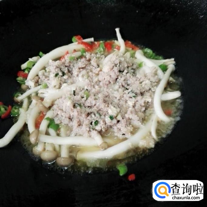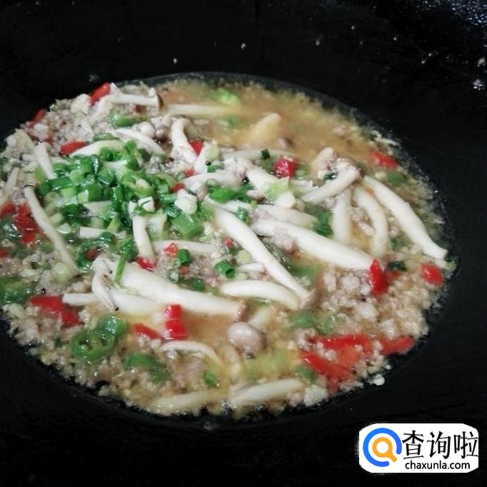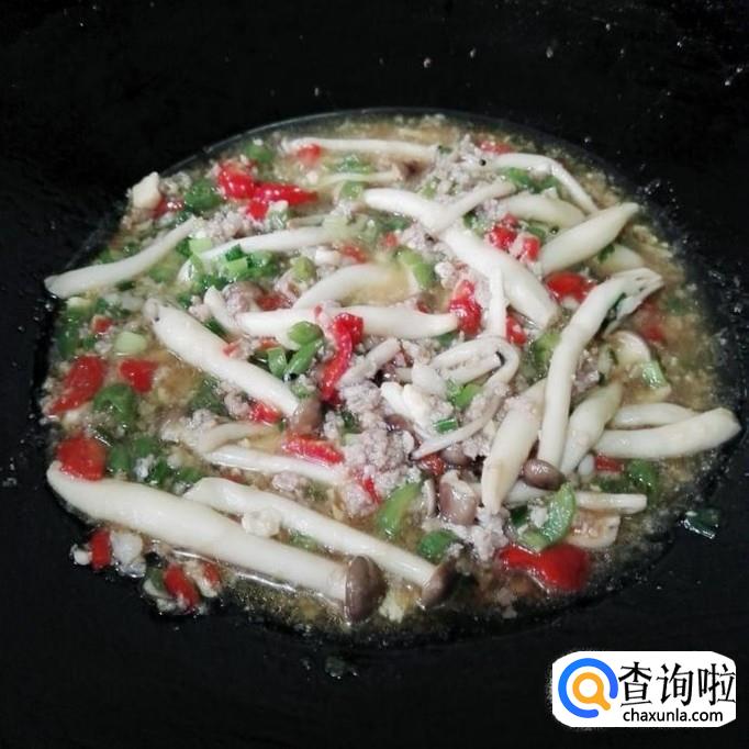 蟹味菇越大火炒炒出来的水份越多,但是不怕,那汁很有营养的。然后把炒好的肉末放下去,加一小勺起再翻炒均匀即可。