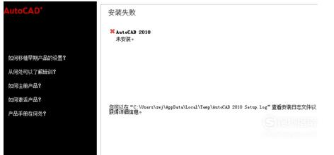 出现这样的情况应该是系统里面残留了之前安装的AutoCAD2010的注册表和安装文件,把这些删除以后就可以正常安装了。