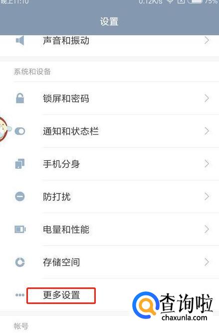 进入设置页面以后,拖动屏幕找到“更多设置”并点击进入。