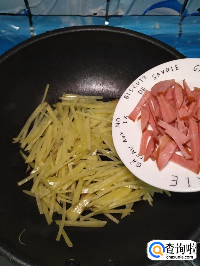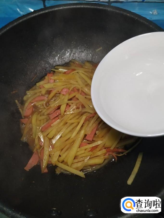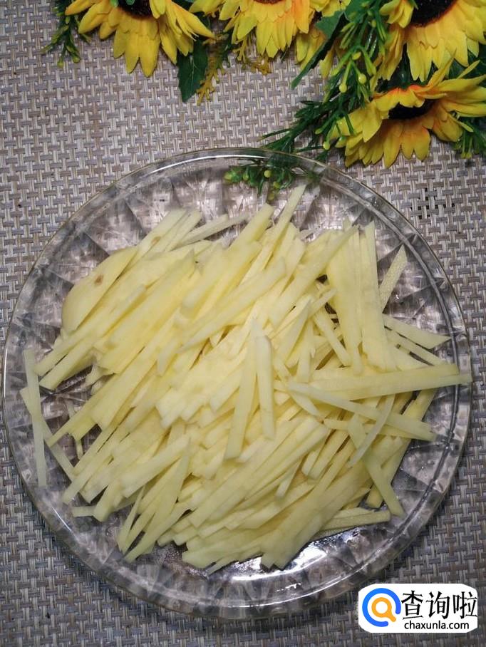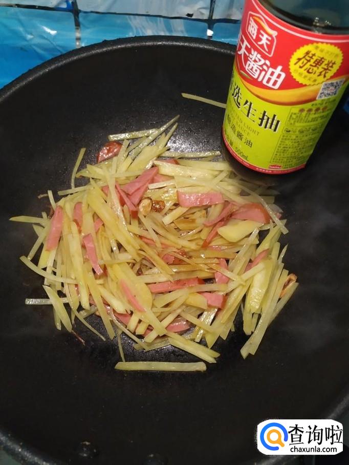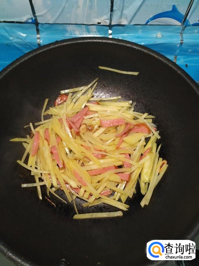 将土豆去除外皮后,切成丝,洗去淀粉备用,再取适量香肠,切成丝备用。