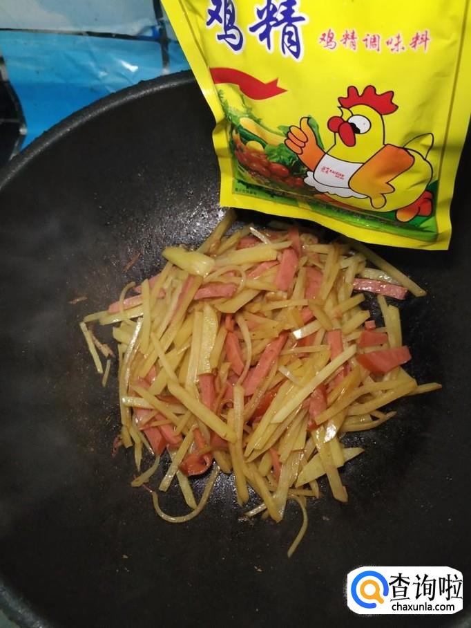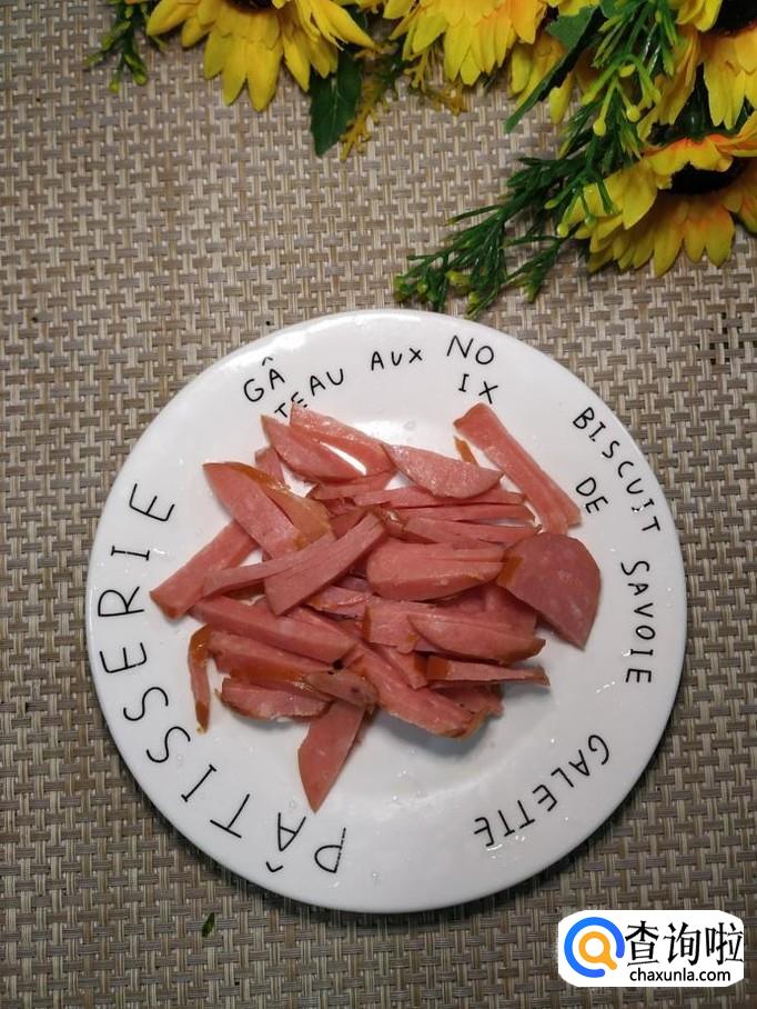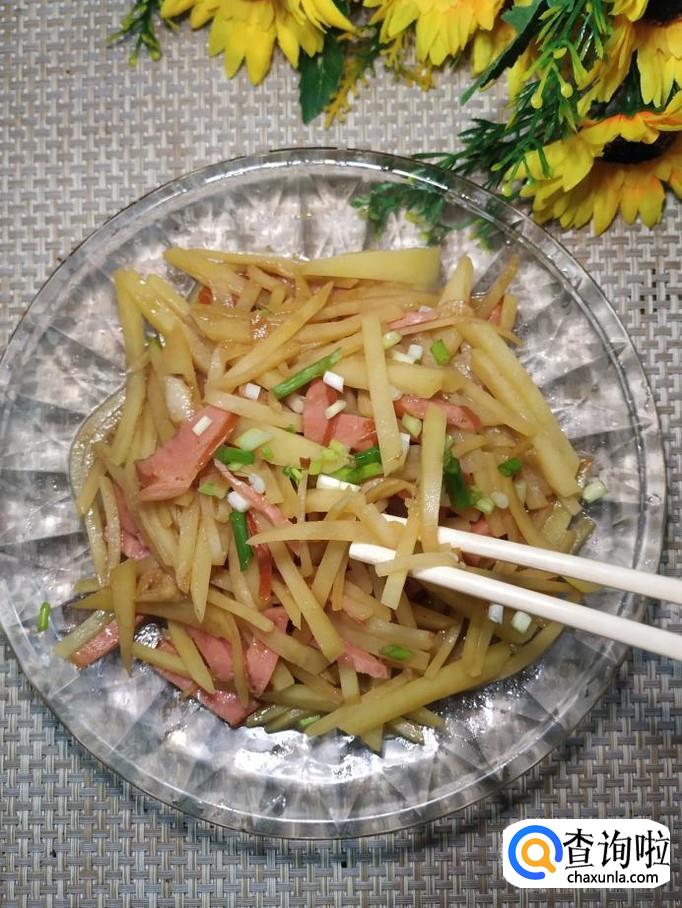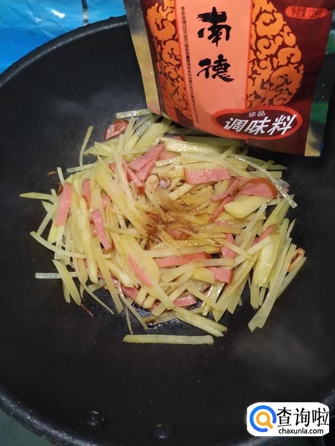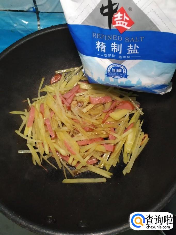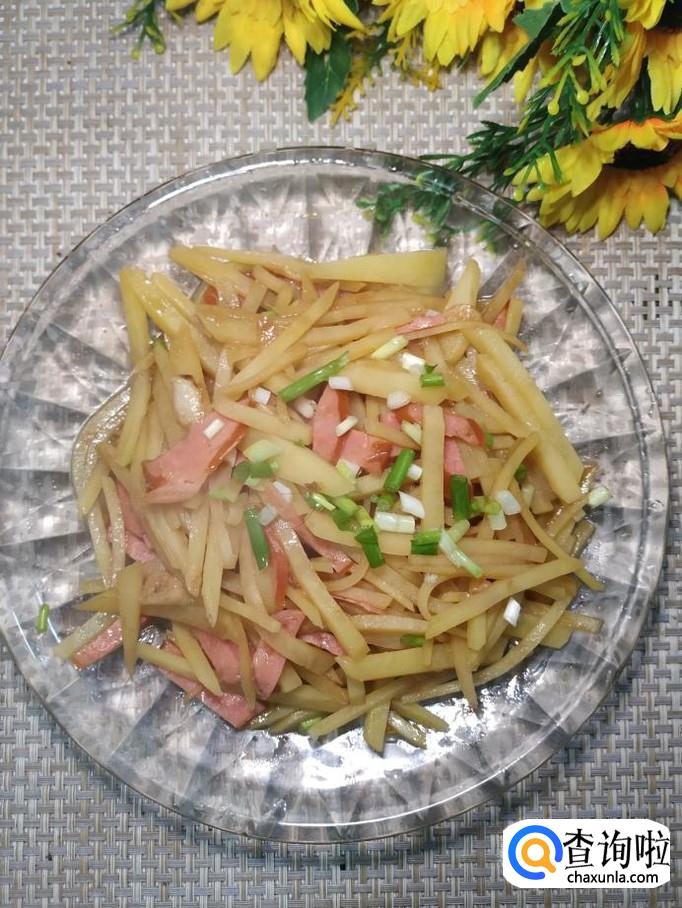 将土豆去除外皮后,切成丝,洗去淀粉备用,再取适量香肠,切成丝备用。