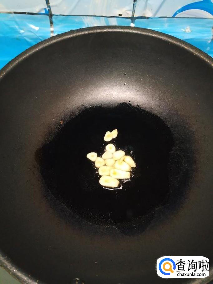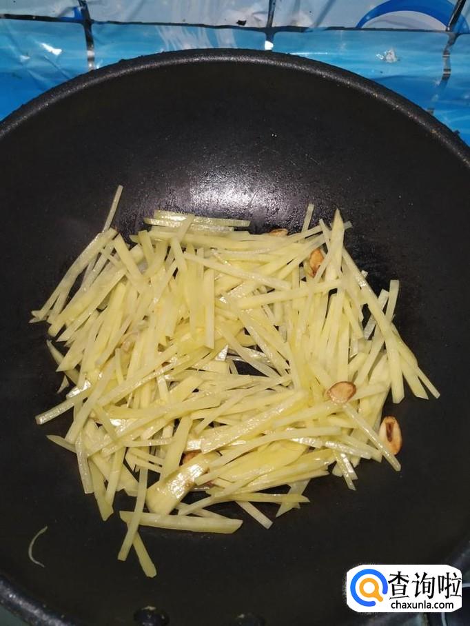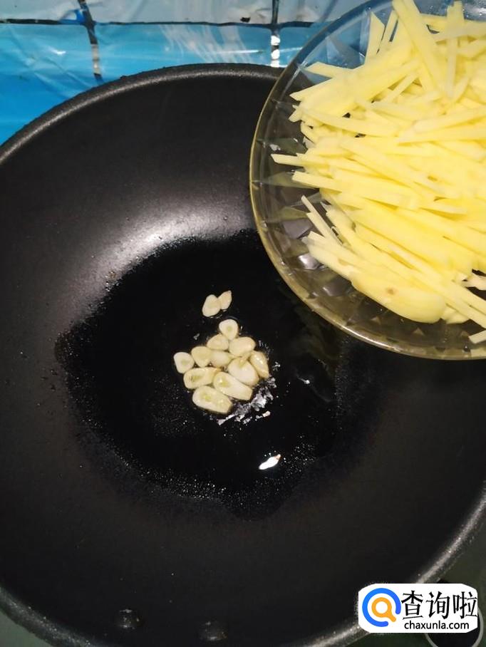 准备适量蒜,去除外衣后,切片备用,炒锅中放入适量油,油热后,将蒜片放入锅中炒一下,然后将土豆丝放入锅中翻炒均匀,炒至土豆表面微微变色。