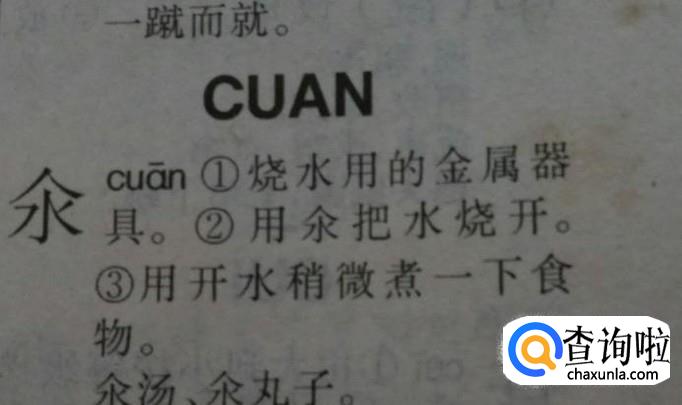“汆”和“氽”:第一个字叫cuan,第二个字叫tun。汆上面的盖头是一个入字,而氽的盖头是一个人。汆的意思是烧水用的金属器具,或者是用开水稍微煮一下食物。氽的意思是用油炸,油氽。