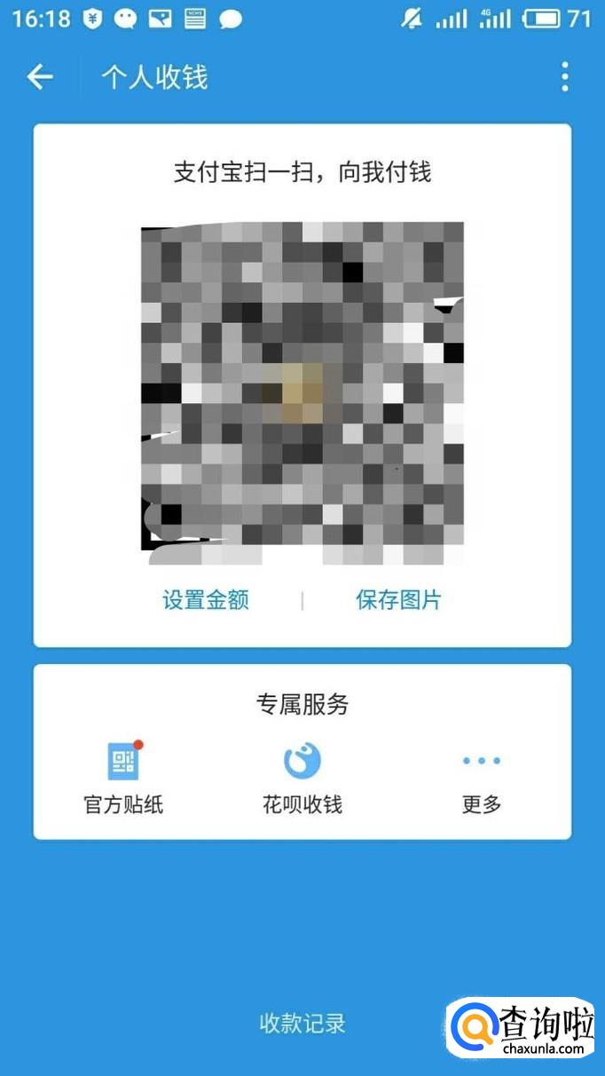 进入支付宝首页后 ,可以看到首页上方有收钱按钮 点击收钱按钮进入该页面。