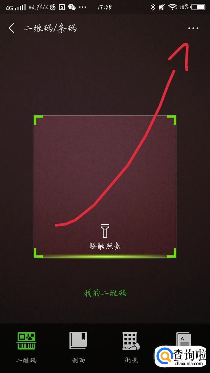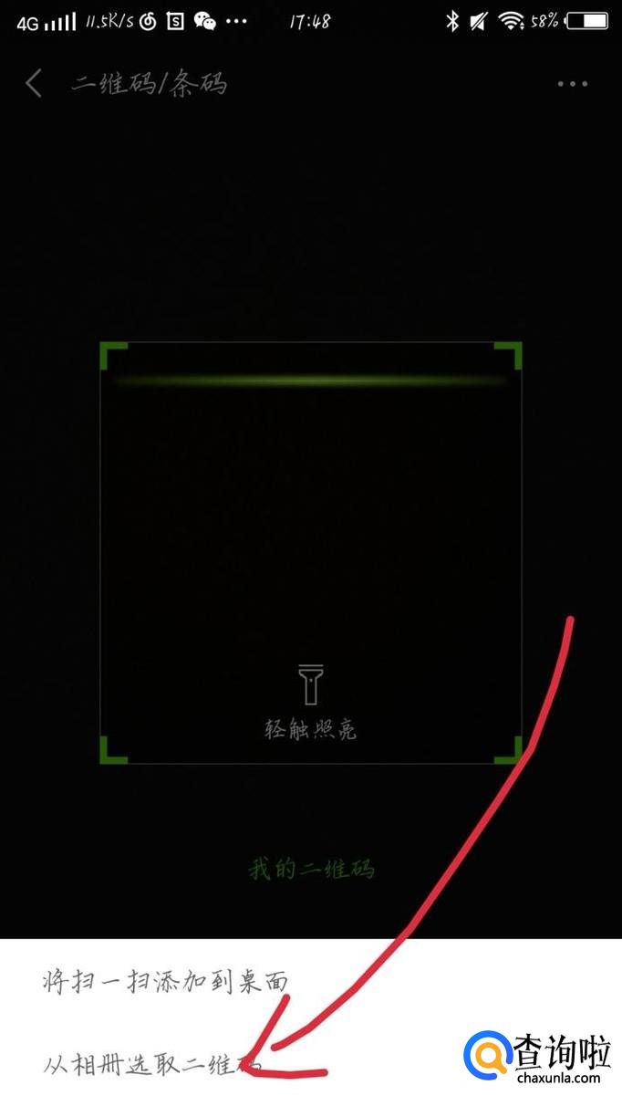 你会看到出现一个新的界面,点击“从相册选取二维码”选项,如图1箭头所示。选取你要扫的二维码就可以了。