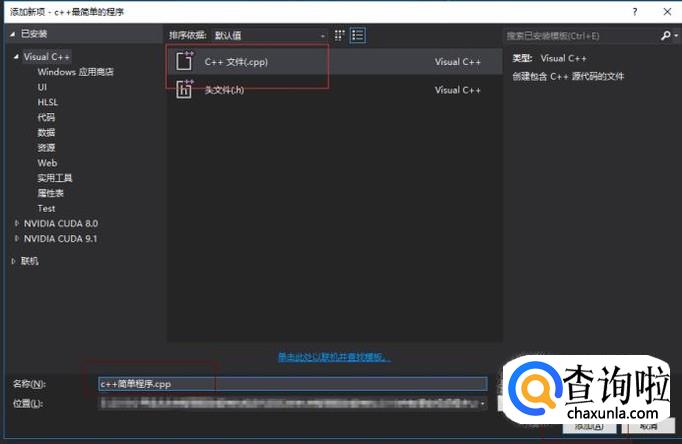 选择C++文件,输入名称,点击添加,如图。