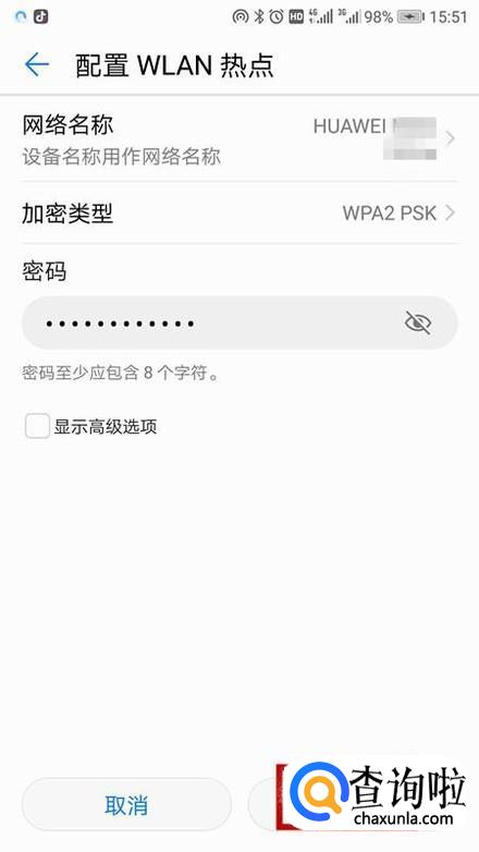 最后输入密码,配置好便携式WLAN热点后点击保存即可。如图所示。