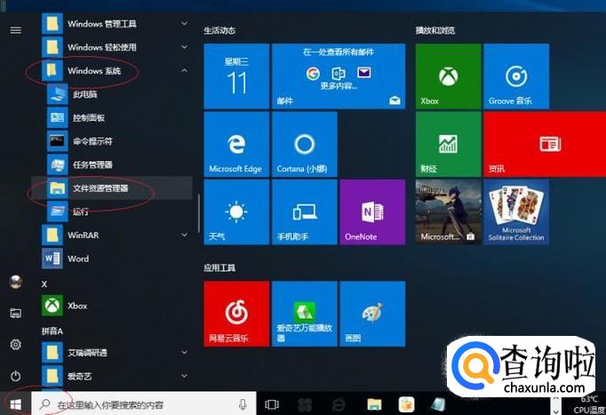 如图所示,弹出开始菜单选项。拖动右侧垂直滚动条,点击"Windows 系统→文件资源管理器"项。