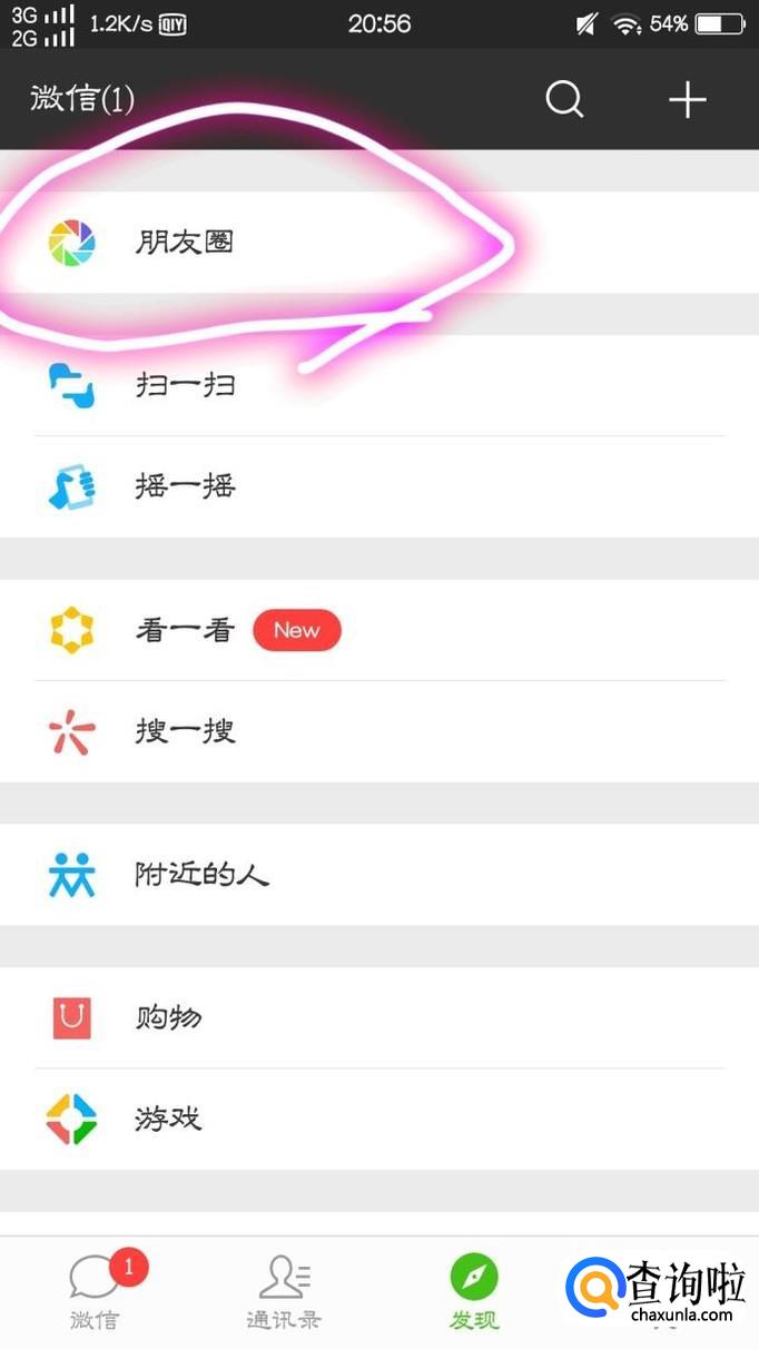 接下来,我们点击“发现”中的“朋友圈”我们可以分享生活的点滴,点击右上角的“拍摄”