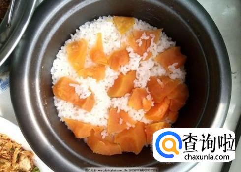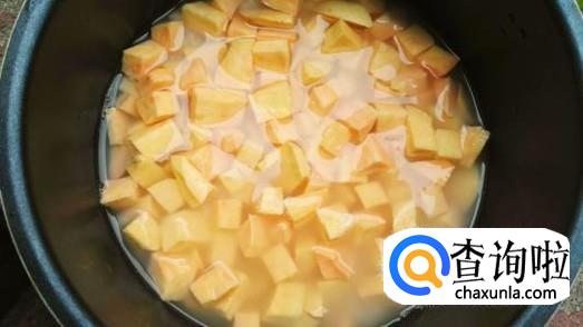 然后把红薯块放入锅中,再稍微加入少许的水,用铲子拌一拌,按下煮饭键