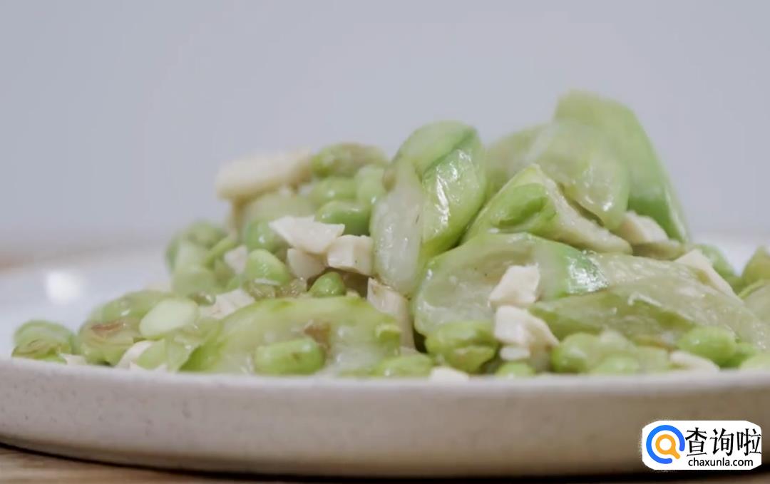 丝瓜 2根、毛豆 200克、盐 1克、糖 3克、扁尖、水、芝麻油、食用油 适量