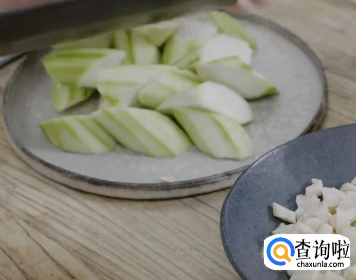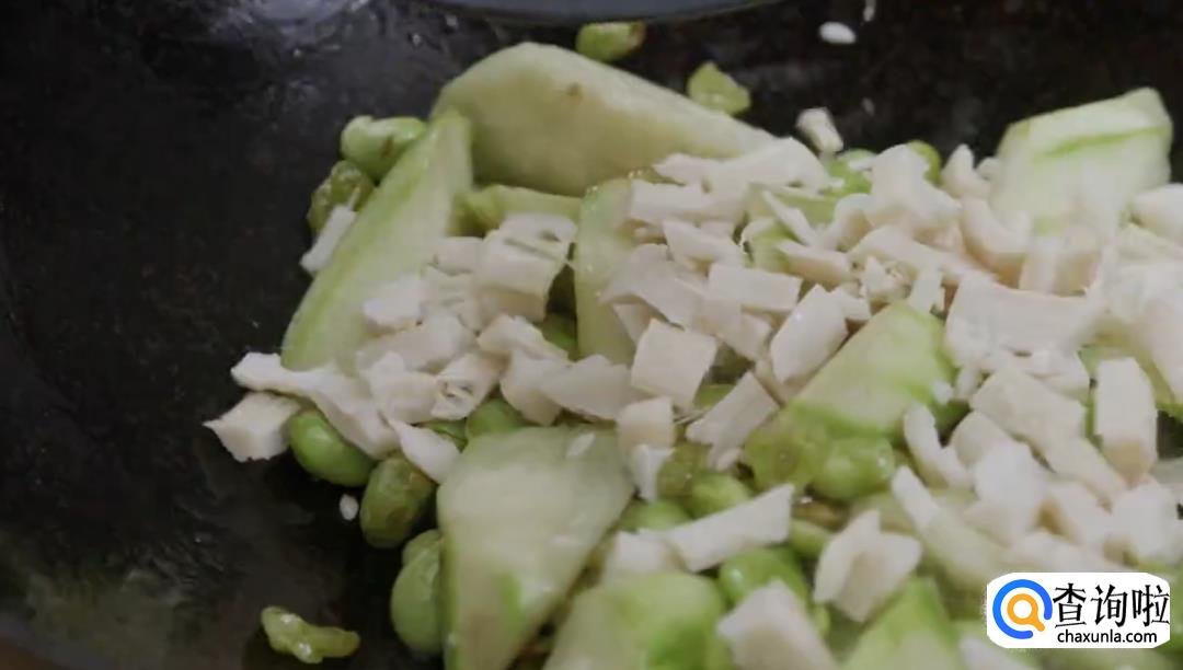 加入丝瓜翻炒后,撒一点盐,然后加入扁尖继续翻炒。