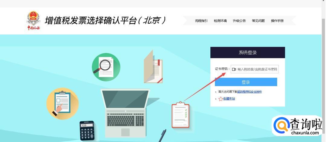 首先,在搜狗高速浏览器中搜索当地的“增值税发票选择确认平台”,然后输入你的税盘密码,点击“登录”。
